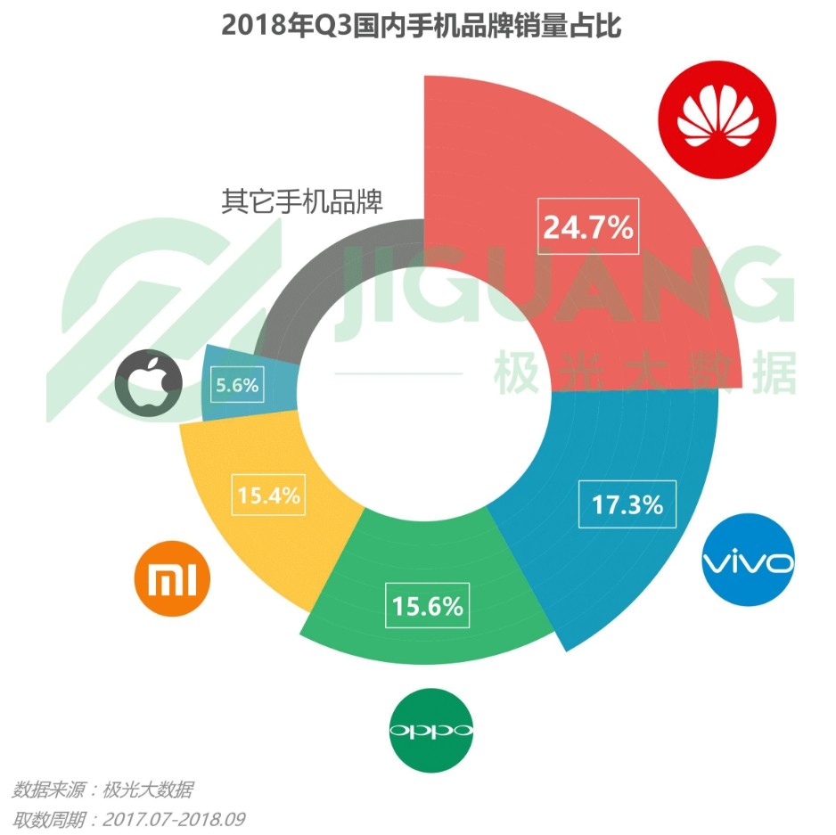 Data from research firm Aurora Big Data show Huawei holding a 24.7% stake in the Chinese market, followed by Vivo by 17.3%. The third place is occupied by Oppo, which maintains the 15.6% with Xiaomi almost surpassing with its 15.4%.